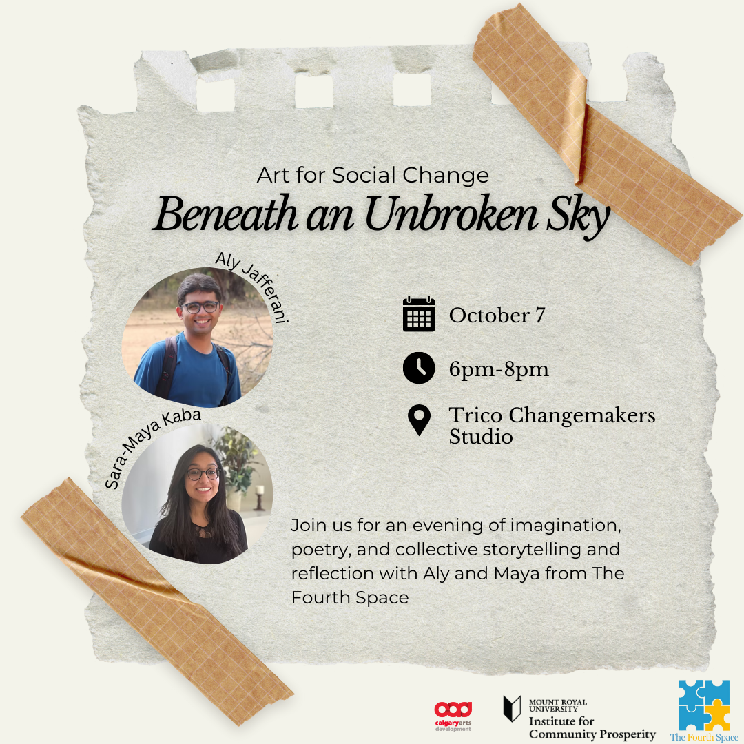Join The Fourth Space facilitators Aly and Maya for an evening of imagination, poetry, and collective storytelling. We will spend our time together reflecting and re-imagining what lies beneath the skies we share. Using poetry, story, and collective reflection, participants will explore how art can give voice to hope. In an inherently collaborative process, participants will explore the sensory landscapes of the spaces we share and co-create poetic stories to envision new and alternative futures.