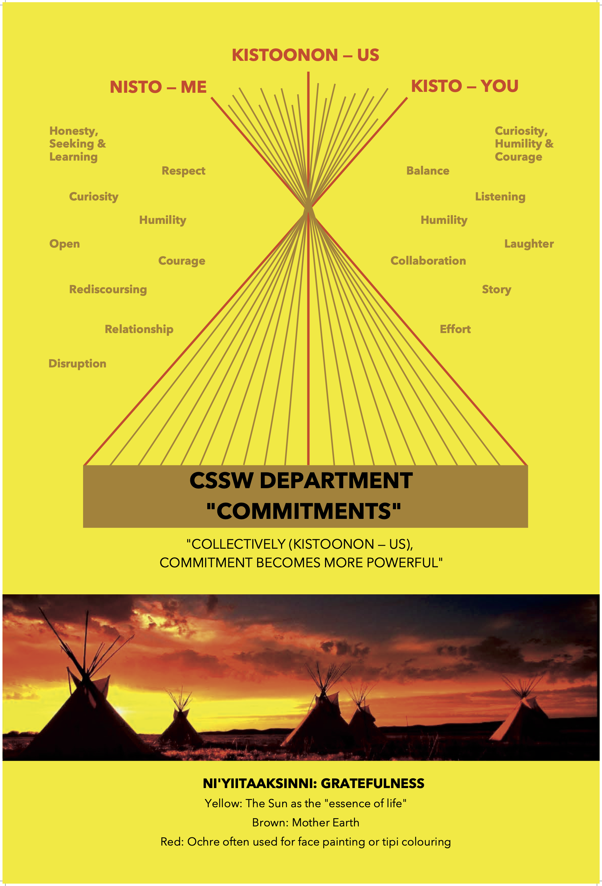 When Indigenous people lived in tipis, the poles were erected to serve as the framework or foundation, to begin the structure of a home ending with the canvas covering the framework. Pegs are used to fasten the canvas together, and stakes to anchor the bottom skirt to the ground. Three poles are tied together to represent Nisto/me, Kisto/you and Kistoonon/us. The three poles are significant because we are all working together as a team and leaning on each other for support as a department. The poles are rooted and connected to the landscape, which is symbolic, Ksah ko’h or the Earth, is represented by the colour brown, yellow represents the Sun (the essence of life), and red represents the ochre that is often used for the face painting or tipi designs. Each attendee was given a skewer (tipi pole) and asked to talk about their pole, and what word they chose to represent their commitment to reconciliation, decolonization or indigenization, and each had a chance to put their tipi pole on the tripod that was already set up on the green felt cloth. The CSSW community sat in a circle representing the circle of life. We followed Indigenous protocols such as starting to the left of the host and each person being given the opportunity to share without interruption from anyone in the circle. Words of commitment were shared, and everyone in attendance had an opportunity to participate in the tipi pole exercise. Indigenous values such as respect, listening with an open heart, community and reciprocity were encouraged.