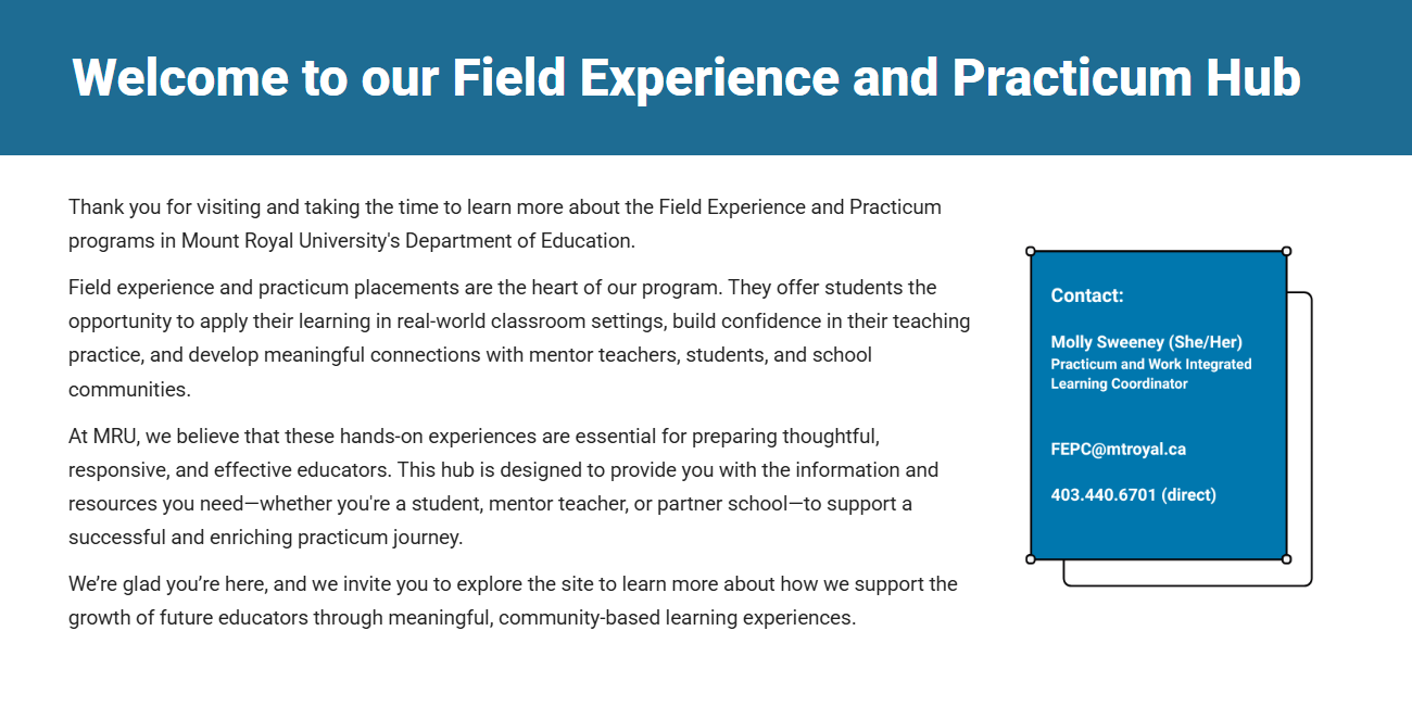 Toggle navigation Education Curriculum & Courses Admission Requirements & Costs Bachelor of Education — Elementary (B.Ed.) Academic Advising Field Experience and Practicum Community Partners Campus Supports for Students Our Stories Faculty & Staff Contact Us Visit the Practicum Hub for information about becoming a mentor teacher and for teacher candidate resources.